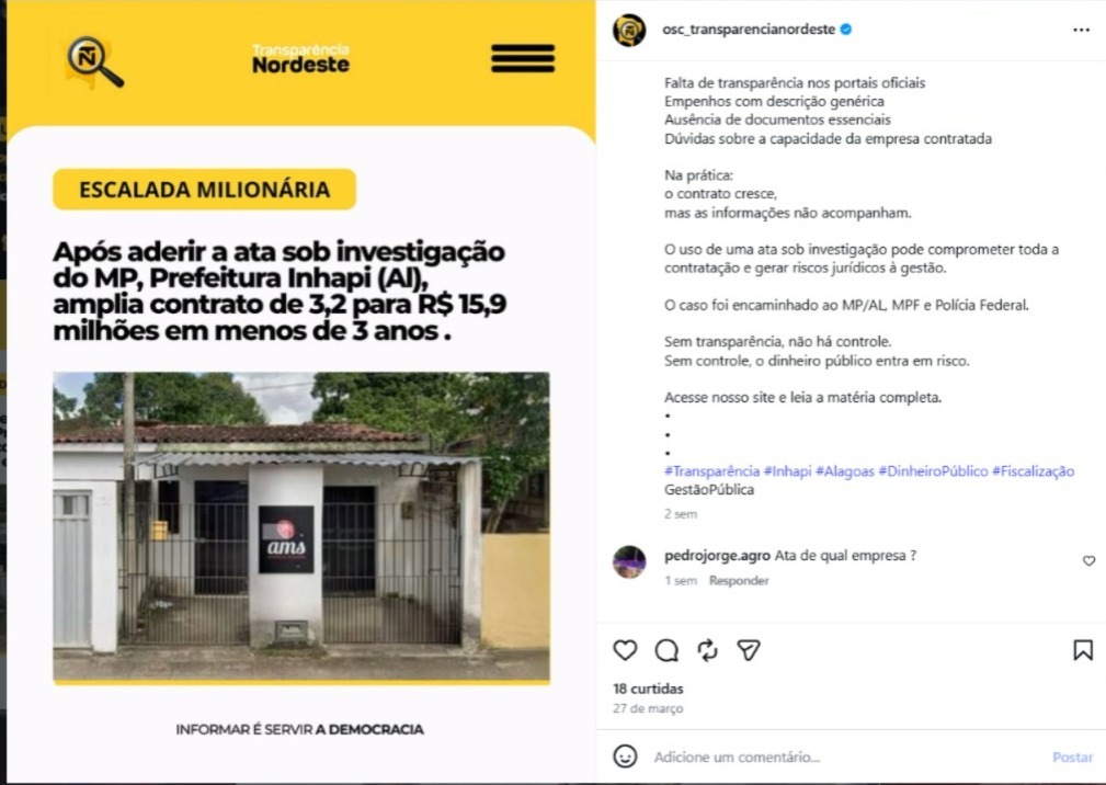 A denúncia ganhou força porque atinge diretamente uma área central da administração pública: a obrigação de dar transparência a contratos custeados com recursos públicos. No retrato desenhado pela apuração, o contrato cresce em ritmo acelerado, mas a documentação disponível ao controle social não acompanha esse avanço. Até a publicação das matérias consultadas, a Prefeitura de Inhapi não havia se manifestado oficialmente sobre os apontamentos.