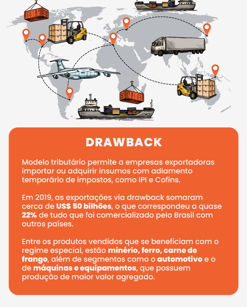 egundo a equipe econômica do governo, as exportações via drawback no ano passado somaram quase US$ 50 bilhões, o que correspondeu a 21,8% de tudo que foi comercializado pelo Brasil com outros países. Entre os produtos vendidos que se beneficiam com o regime especial, estão minérios, ferro, carne de frango, além de segmentos como o automotivo e o de máquinas e equipamentos, que possuem produção de maior valor agregado.