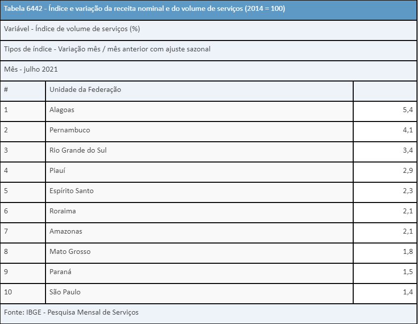 De acordo com o economista, o período do bom desempenho coincidiu, em Alagoas, com a maior flexibilização das restrições de funcionamento do Comércio, incluindo bares e restaurantes, setores importantes para o turismo. E, segundo a análise do IBGE, uma possível explicação para esse resultado está na dinâmica trazida pela atividade dos serviços prestados à família, que cresceu 3,8% no mês e acumula ganho de 38,4% entre abril e julho.