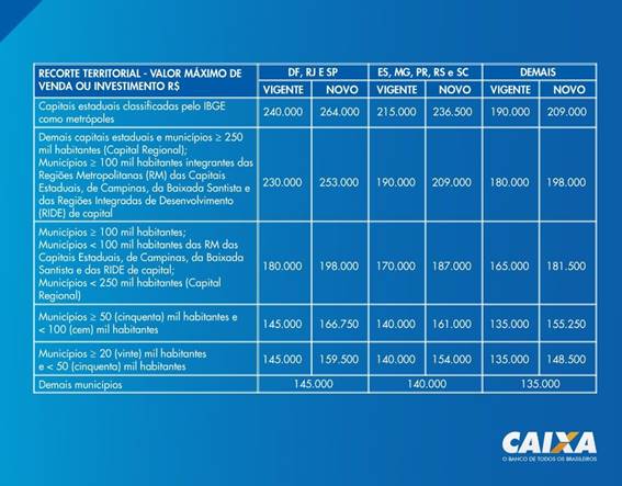 De acordo com as Resoluções CCFGTS nº 1.008/2021 e nº 1.009/2021, de 15 de setembro de 2021, houve aumento do teto dos valores de venda ou investimento dos imóveis, de acordo com o recorte territorial, com variação entre R$ 135 mil e R$ 264 mil.