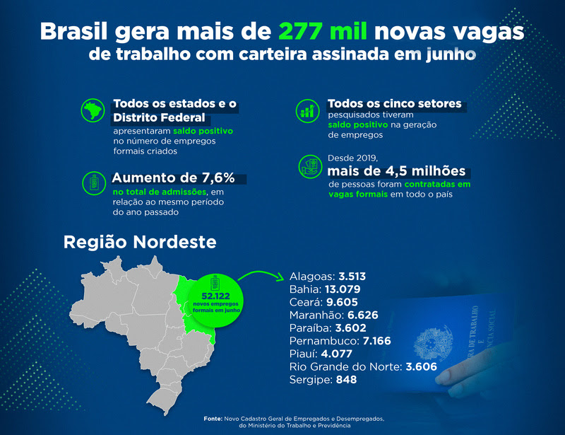 Em toda a Região Nordeste, foram computadas 52.122 novas vagas formais, com o maior registro no estado da Bahia (13.079), seguido por Ceará (9.605) e Pernambuco (7.166). Todos os outros estados também tiveram alta no mês de junho, com a sequência formada por Maranhão (6.626), Piauí (4.077), Rio Grande do Norte (3.606), Paraíba (3.602), Alagoas (3.513) e Sergipe (848).