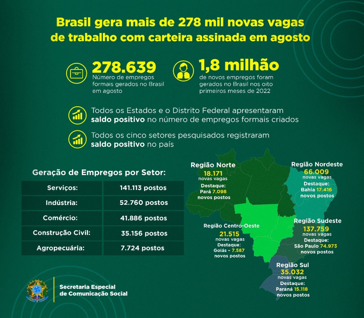 Os dados de agosto demonstram, ainda, que somente no intervalo de julho de 2020 a agosto de 2022 – considerado o período de retomada do emprego formal – o país registrou um saldo positivo de 5.836.476 postos de trabalho.
