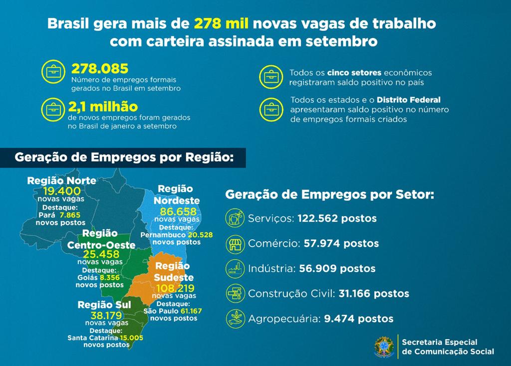 O Brasil segue em curva ascendente na geração de empregos, conquistando recordes sucessivos na abertura de novos postos formais de trabalho. Segundo dados divulgados nesta quarta-feira (26) pelo Novo Caged, o Cadastro Geral de Empregados e Desempregados, o emprego celetista no Brasil apresentou crescimento em setembro, tendo registrado saldo positivo de 278.085 novos postos formais de trabalho.