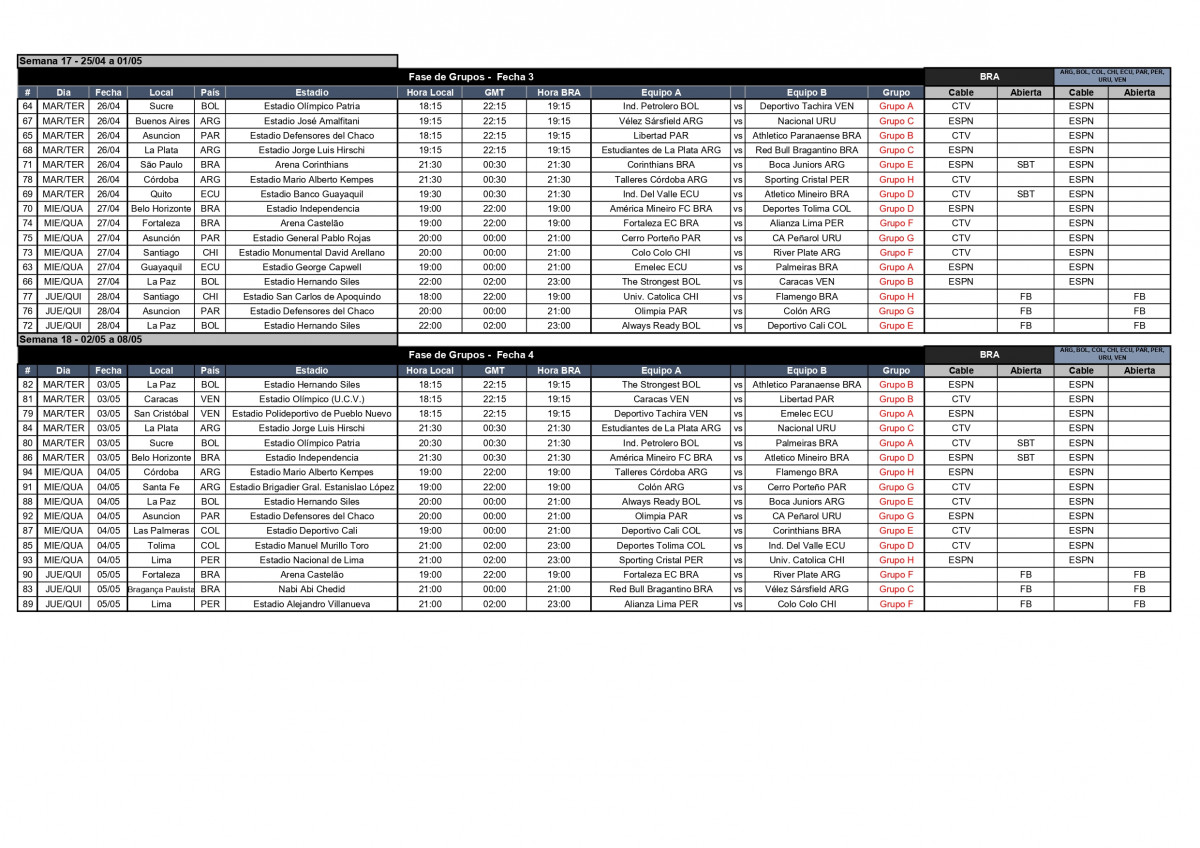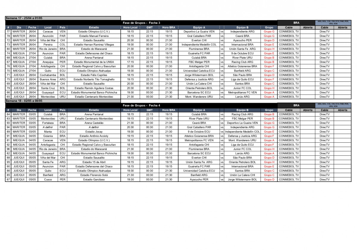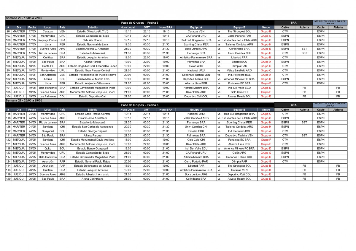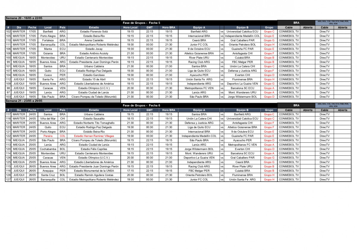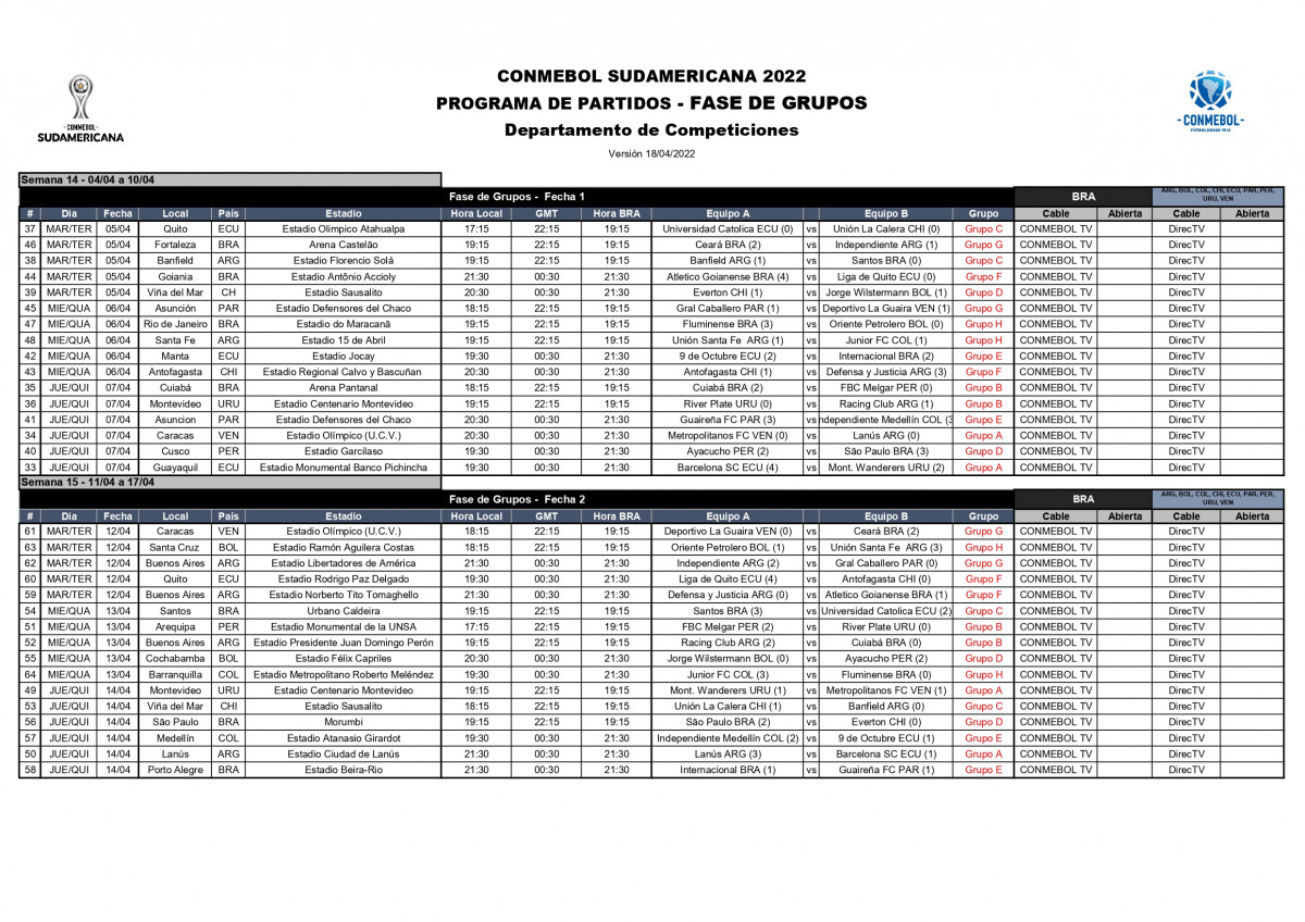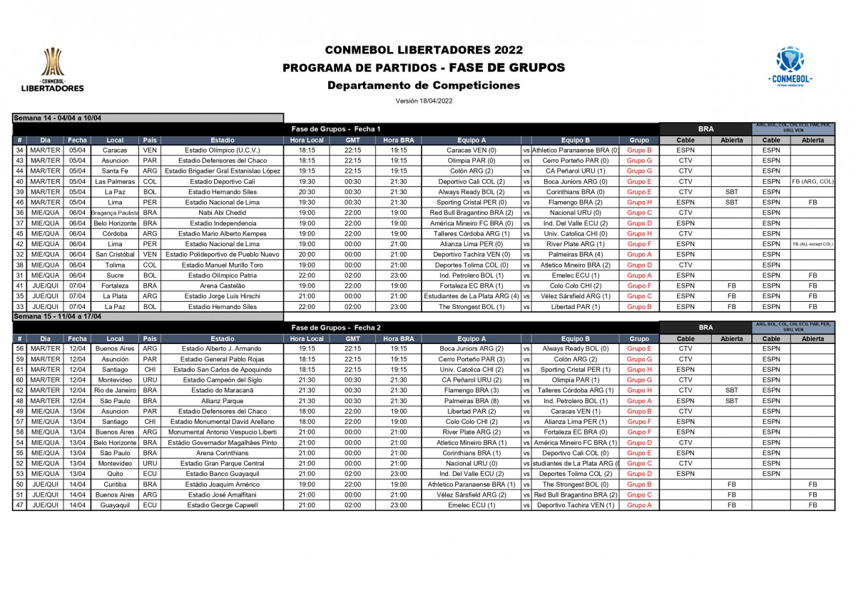 A Direção de Competições e Operações da CONMEBOL atualizou o calendário dos jogos correspondentes à Fase de Grupos da CONMEBOL Libertadores 2022 e CONMEBOL Sudamericana 2022.
