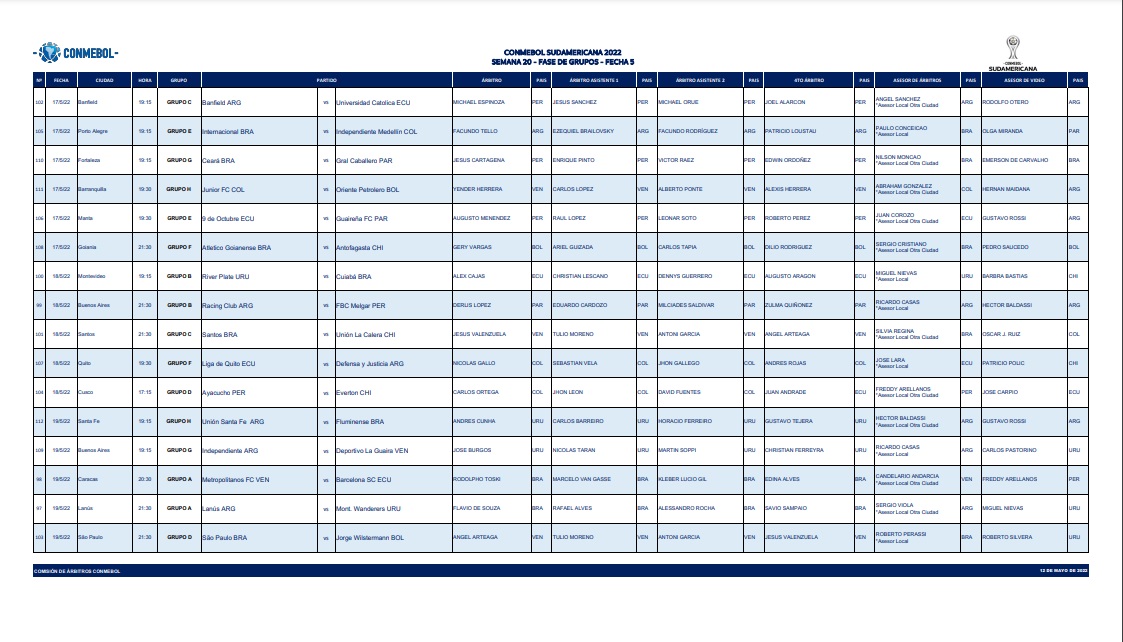 A Comissão de Árbitros da CONMEBOL revelou a lista de árbitros designados para dirigir os jogos da 5ª semana da Fase de Grupos da CONMEBOL Libertadores 2022.