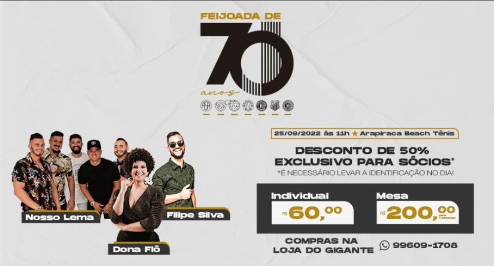 Com mesas no valor de R$400,00 e entradas individuais na quantia de R$120,00, o GIGANTE chega aos seus 70 anos com sorteio de camisas e uma feijoada de dar água na boca.