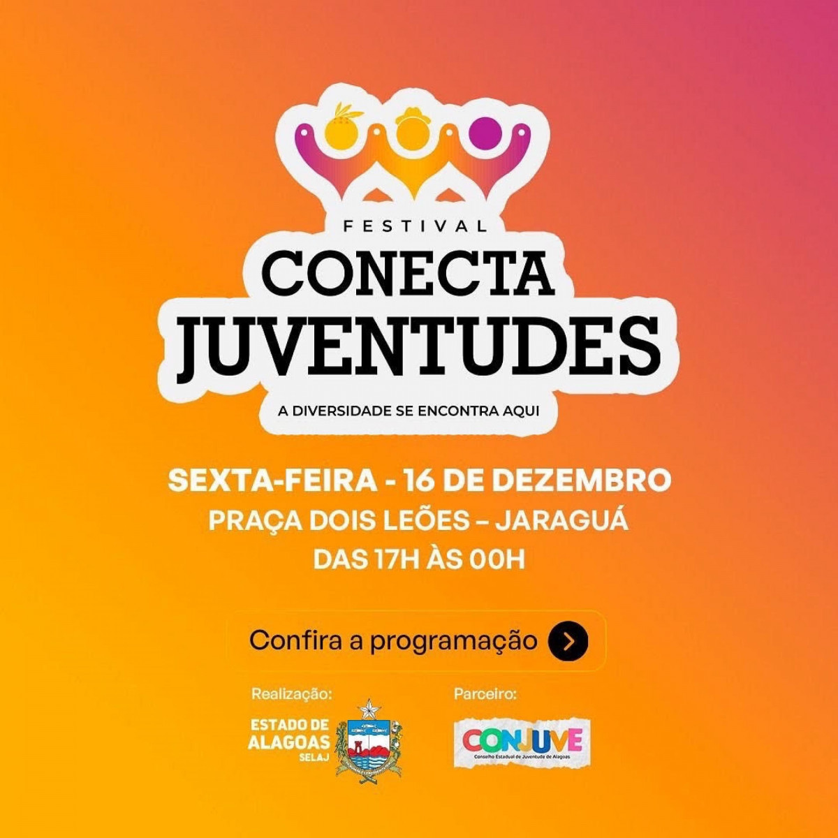 A programação terá início às 17h na Praça Dois Leões, no bairro de Jaraguá. A estrutura montada terá abertura oficial com Toré da juventude indígena Tinguí-Botó, novas políticas públicas para as juventudes alagoanas, oficinas e muita música, até a meia-noite.