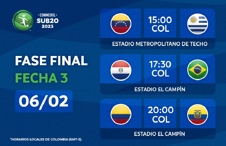 A terceira jornada do Hexagonal Final da CONMEBOL Sub20 será disputado nesta segunda-feira, 6 de fevereiro, no Estadio Metropolitano de Techo e no El Campín de Bogotá.