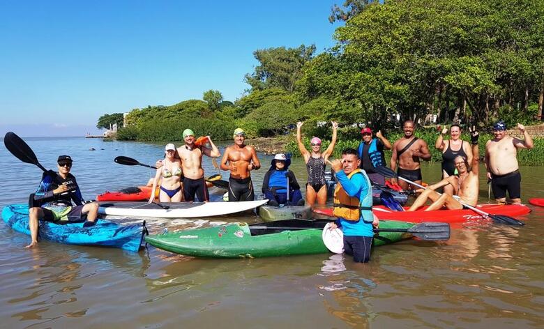 A praia de Belém Novo, em Porto Alegre, recebeu os nadadores e remadores do Projeto Nadando Pelos Cartões Postais, na manhã ensolarada deste domingo (12/2) com muita diversão, esporte e adrenalina. No total foram 12 atletas que fizeram o percurso de 3.600 metros, ida e volta, da Praça José Comunal até a Ilha das Pedras.