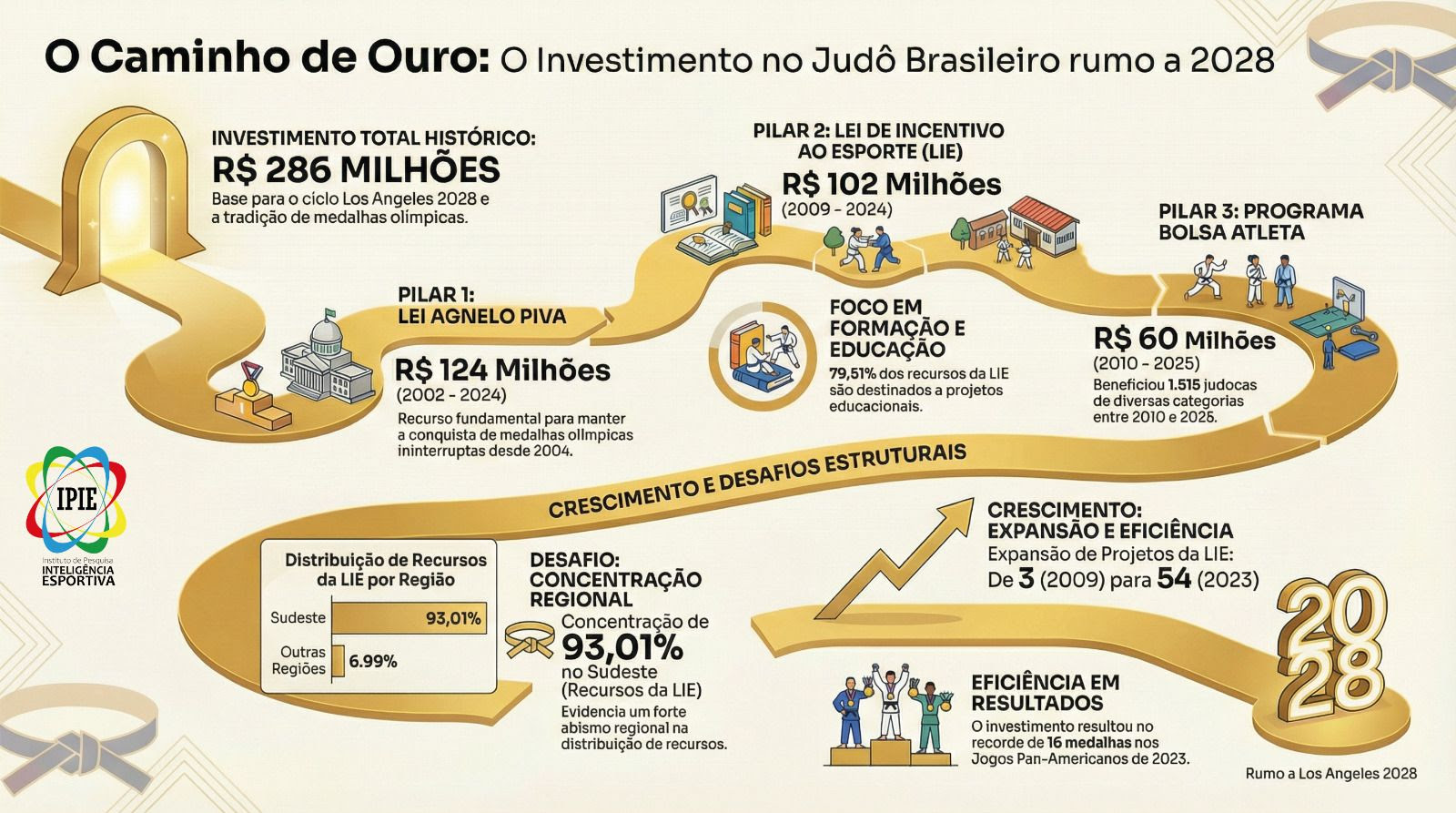 O judô brasileiro inicia sua caminhada rumo aos Jogos Olímpicos de Los Angeles 2028 com a disputa do Paris Grand Slam 2026, que ocorrerá entre 7 e 8 de fevereiro, na Accor Arena, na França. A participação dos atletas brasileiros em eventos de elite é sustentada por um investimento histórico que já soma R$ 286 milhões via leis de incentivo e programa Bolsa Atleta, consolidando a modalidade como uma das mais bem financiadas do país, segundo levantamento realizado pelo Instituto de Pesquisa Inteligência Esportiva da Universidade Federal do Paraná (IPIE/UFPR).