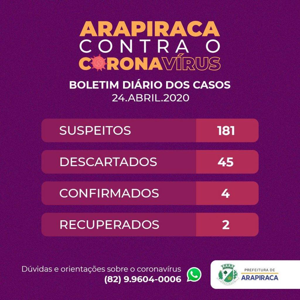 O número de casos confirmados subiu para 4, além de 181 suspeitos, 45 descartados e dois já estão recuperados. Então, vamos continuar nos prevenindo.