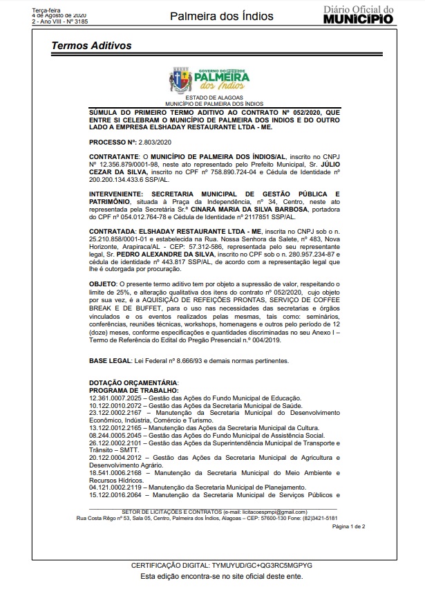 Segundo diz os termos do contrato, o valor não foi divulgado e o seu tempo de duração é de um ano, assim como contrariou as determinações do Decreto Estadual, a respeito das ações de combate ao novo Coronavírus.