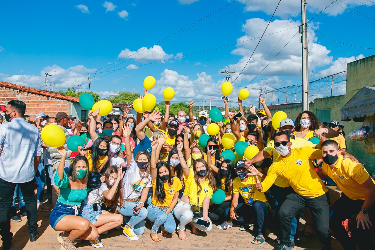 Petrúcio Barbosa candidato a prefeito e Alberes Cândido, vice ao lado de apoiadores, entre eles o deputado federal Nivaldo Albuquerque