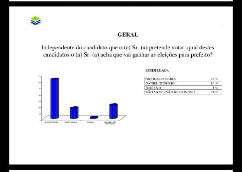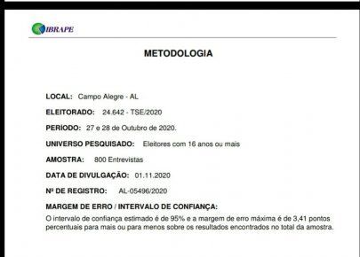 Divulgada nesta segunda-feira, pesquisa de opinião aponta vitória de Nicolas Pereira em Campo Alegre. Foram ouvidos 800 eleitores do município , com idade de 16 anos ou mais,entre os dias 27 e 28 de outubro. Com grau de confiança de 95% e margem de erro de 3,41% para mais ou menos sobre os resultados no total da amostra para os resultados gerais, a pesquisa está registrada no TRE sob o nº AL 05496/2020.