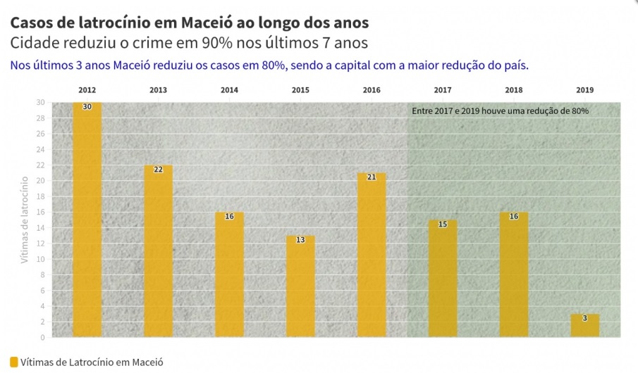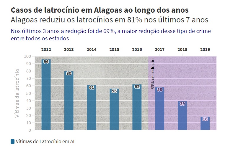 A queda no número de latrocínios na capital alagoana é ainda maior quando analisados os dados de 2012 a 2019. Neste período a capital registrou uma redução de 90%, saindo de 30 casos para apenas 3. Alagoas também apresentou uma queda expressiva, já que em 2012 registrou 96 casos de latrocínio, mas em 2019 teve apenas 18 em todo o estado, representando uma redução de 81,25%.