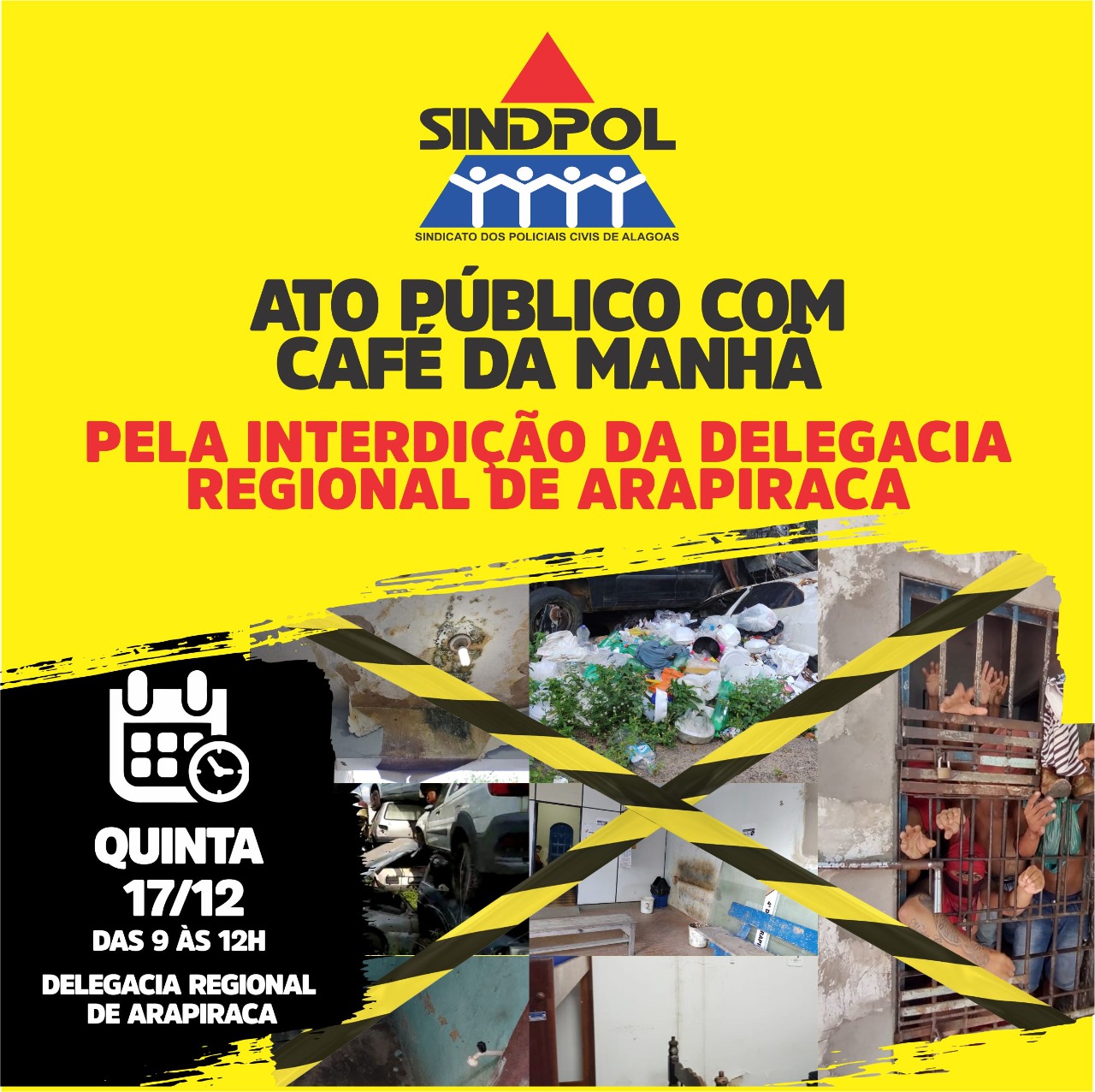 O Sindicato dos Policiais Civis de Alagoas (Sindpol) realizará ato público com café da manhã, em frente à Delegacia Regional de Arapiraca, nesta quinta-feira (17), das 9 às 12 horas, contra o descaso do Governo do Estado e as precárias condições de trabalho na delegacia.