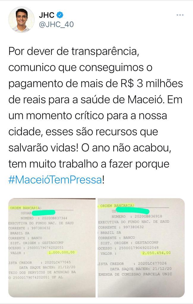 “Por dever de transparência, comunico que conseguimos o pagamento de mais de R$ 3 milhões de reais para a saúde de Maceió. Em um momento crítico para a nossa cidade, esses são recursos que salvarão vidas. O ano não acabou, tem muito trabalho a fazer porque Maceió tem pressa”, explicou JHC.