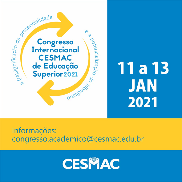 O Congresso Internacional de Educação Superior Cesmac, acontece de 11 a 13 de janeiro de 2021, com o tema (Re)significação da Presencialidade e Potencialização do Hibridismo, põe-se na contramão dos enfrentamentos decorrentes da crise sanitária instaurada mundialmente, decorrente da COVID-19.