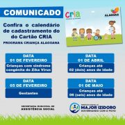 Em solenidade que contou com a presença do secretário estadual de Assistencia e Desenvolvimento Social, Sílvio Bulhões, a prefeitura de Major de Izidoro, realizou na última sexta-feira, 8, o lançamento do Cartão Cria, programa do governo do Estado e que garante ajuda financeira a gestantes de baixa renda no valor mensal de R$ 100, cujo pagamento já começa na segunda quinzena de fevereiro.
