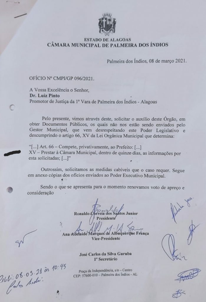 Após convocações frustradas de secretários e outras em que os titulares de pastas apareceram para “empurrar com a barriga” a entrega de documentos solicitadas pelos vereadores, estes resolveram através do ofício n.º 096/2021 encaminhar ao promotor de Justiça Luiz Pinto, da primeira promotoria de Justiça de Palmeira dos Índios, solicitando o auxílio do Ministério Público para que se faça cumprir a Lei Orgânica Municipal, especialmente no que tange ao artigo 66, XV, que remete à municipalidade o dever de prestar contas de suas ações e despesas em 15 dias, fato que não ocorreu até o presente momento.
