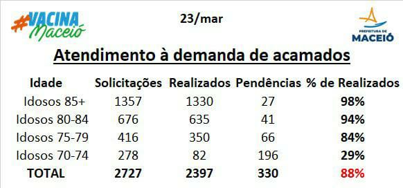 A SMS esclarece, no entanto, que o cadastramento é apenas o passo inicial para o agendamento da vacinação. “O cadastro do idoso acamado não é um agendamento. A ida da equipe de vacinação na casa do idoso cadastrado será definida em um novo contato por telefone com a família ou o responsável, seguindo a ordem dos registros feitos por cada um dos Distritos Sanitários da cidade. O importante, porém, é que, com o cadastro efetivado, a vacinação está assegurada”, ressalta a enfermeira Raelma Albuquerque, técnica da Gerência de Imunizações.