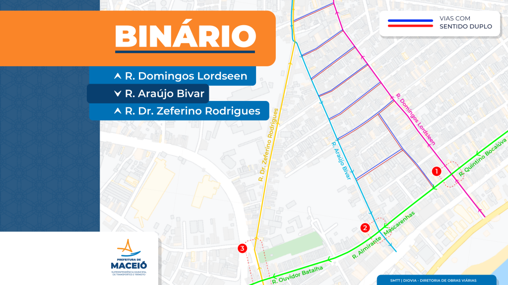A Prefeitura, por meio da Superintendência Municipal de Transportes e Trânsito (SMTT), informa à população que, a partir deste sábado (22), iniciará um novo binário no trânsito da Pajuçara. A mudança transformará as ruas Domingos Lordsleen, Araújo Bivar e Doutor Zeferino Rodrigues em vias de sentido único.
