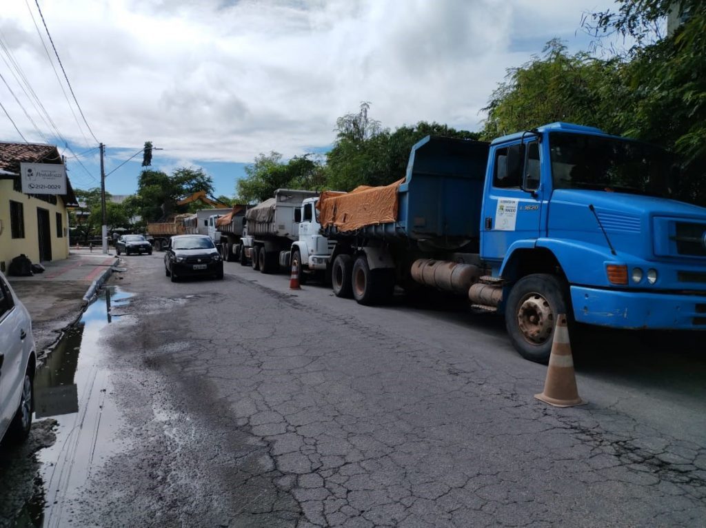Caminhões carregadores de detritos e sedimentos retirados do Riacho Salgadinho. Foto: Ascom Sudes
