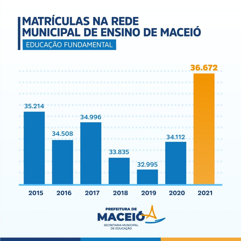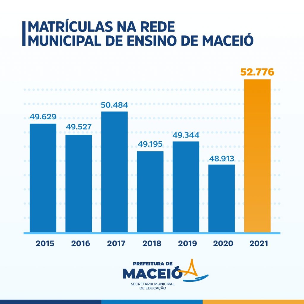 Em 2021, a Educação de Maceió atingiu um número histórico de alunos matriculados na rede municipal. Desde 2015, a Secretaria Municipal de Educação (Semed), não registrava um aumento de alunos matriculados. Agora, já são 52.776 inscritos para o Ensino Fundamental, Infantil e de Jovens, Adultos e Idosos (EJAI).