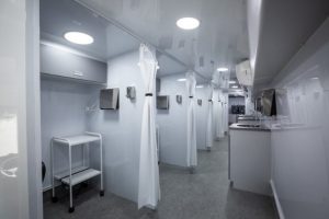 Ele também conta com sala de monitoramento com notebooks e monitores, reservatórios de álcool gel e de papel toalha, pias com reservatórios de sabão líquido, banheiro e filtro de água. O veículo é refrigerado com ar-condicionado e possui toldos na parte externa para abrigar quem estiver na fila de espera.