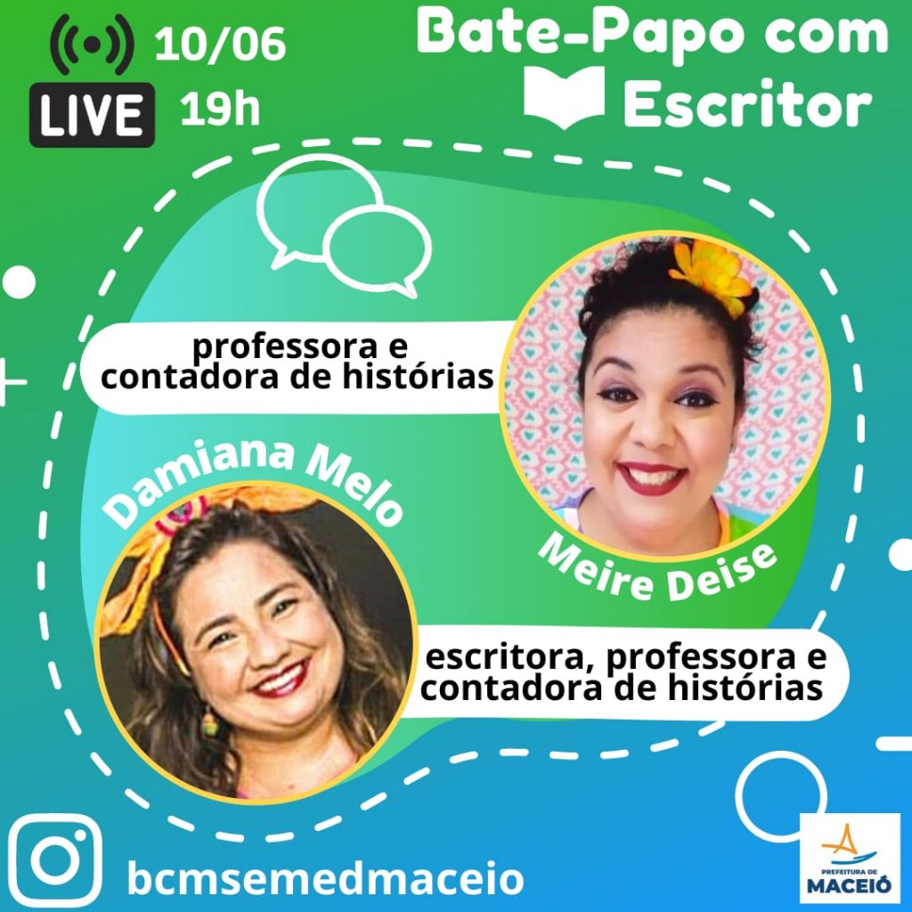 A Biblioteca Carlos Moliterno da Secretaria Municipal de Educação (Semed) realiza, nesta quinta-feira (10), às 19h, a live “Bate Papo com Escritores”. O encontro virtual será transmitido pelo instagram da biblioteca @bcmsemedmaceio e será conduzido pela contadora de história da Semed, Meire Deise, e pela escritora, professora e também contadora de história, Damiana Melo.