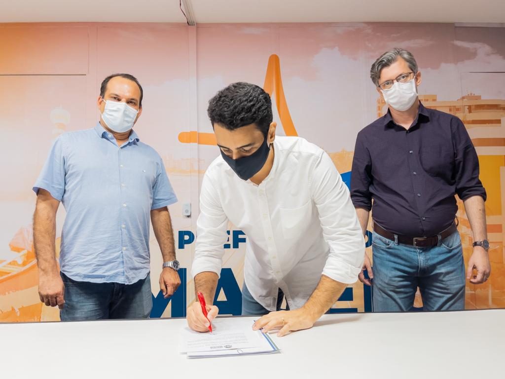 Prefeito JHC autoriza a vigência do concurso da Educação ao lado dos secretário Francisco Salles, de Governo e Elder Maia, da Educação. Foto: Edvan Ferreira/Secom Maceió