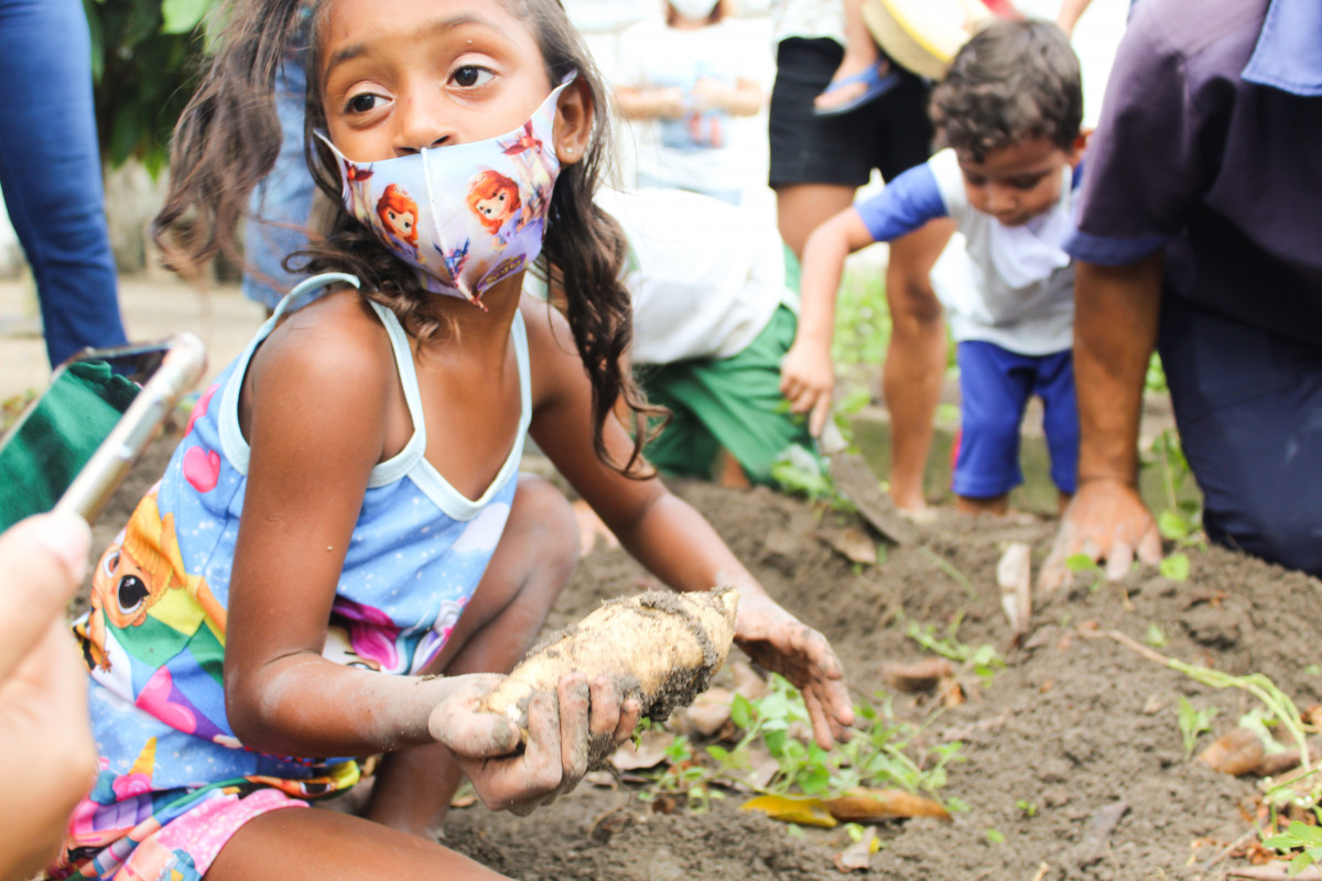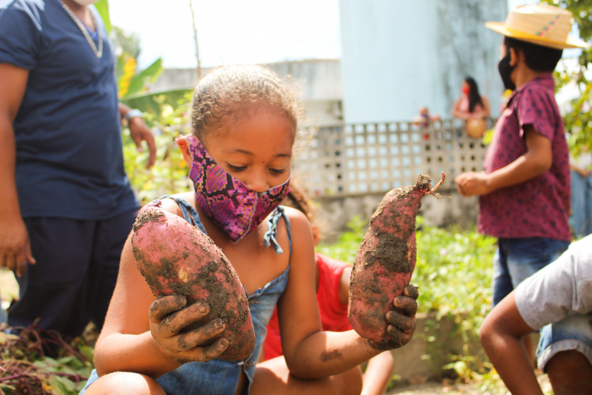 Crianças se divertem e aprendem em colheita de horta no Benedito Bentes