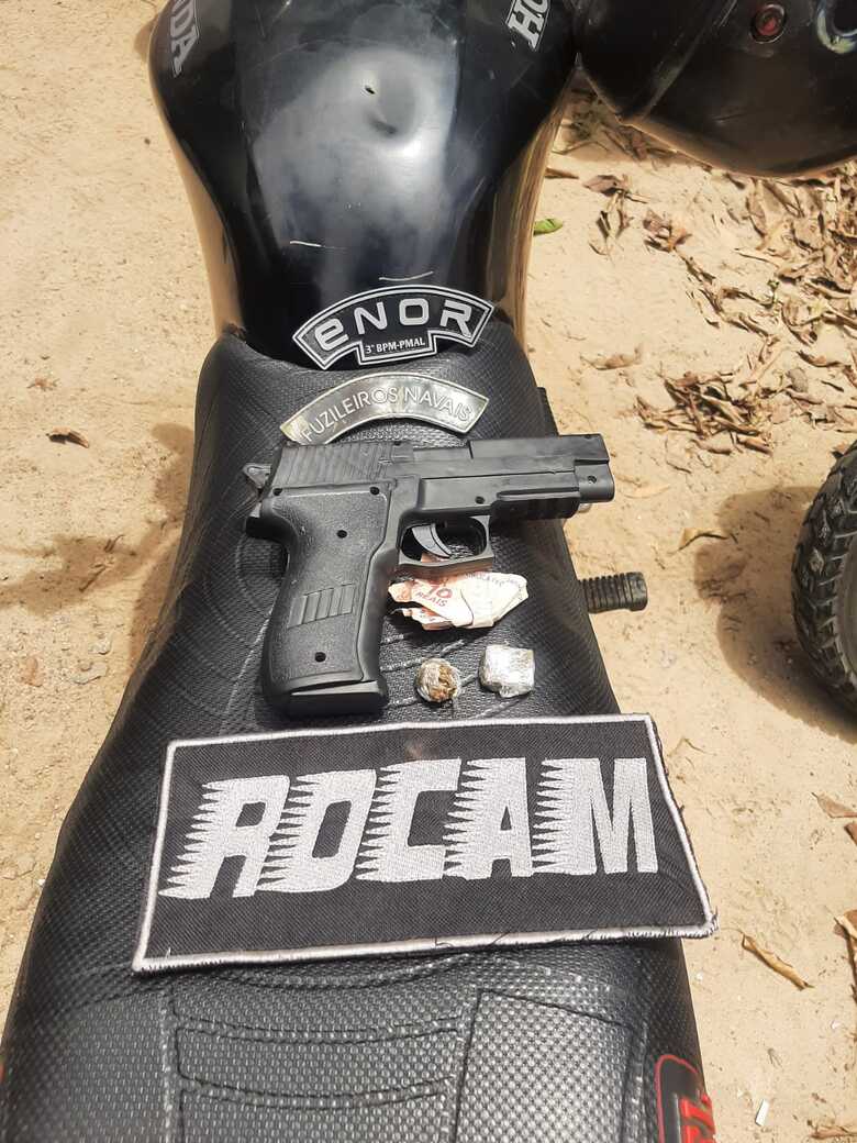 Ainda na Capital do Agreste, mas no final da manhã, o Pelotão de Rocam prenderam um homem de 36 anos com um simulacro de arma de fogo, bombinhas de maconha e R$ 10,00 no bairro Olho D’Água dos Cazuzinhas. O indivíduo estava numa Honda CG 125 Fan, de cor preta, quando foi avistado em atitude suspeita pela guarnição.