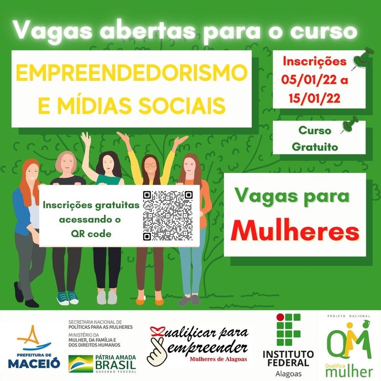 A Pró-Reitoria de Extensão abriu, na última quarta-feira (5), as inscrições referentes ao processo para o curso de Formação Continuada do Projeto Qualificar para Empreender (Mulheres de Alagoas), Empreendedorismo e Mídias Sociais, ofertado pelo do Instituto Federal de Alagoas (Ifal), em parceria com o Ministério da Mulher, da Família e dos Direitos Humanos.