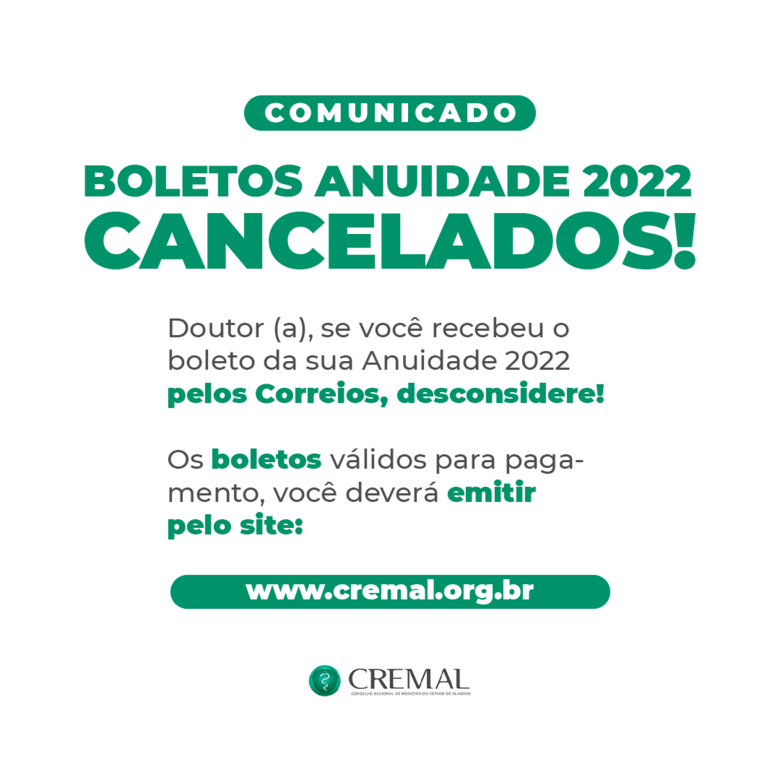 O Conselho Regional de Medicina de Alagoas – CREMAL informa que ocorreu um erro por parte da instituição financeira responsável pela emissão dos boletos, na geração dos códigos de barras referentes a Anuidade 2022.