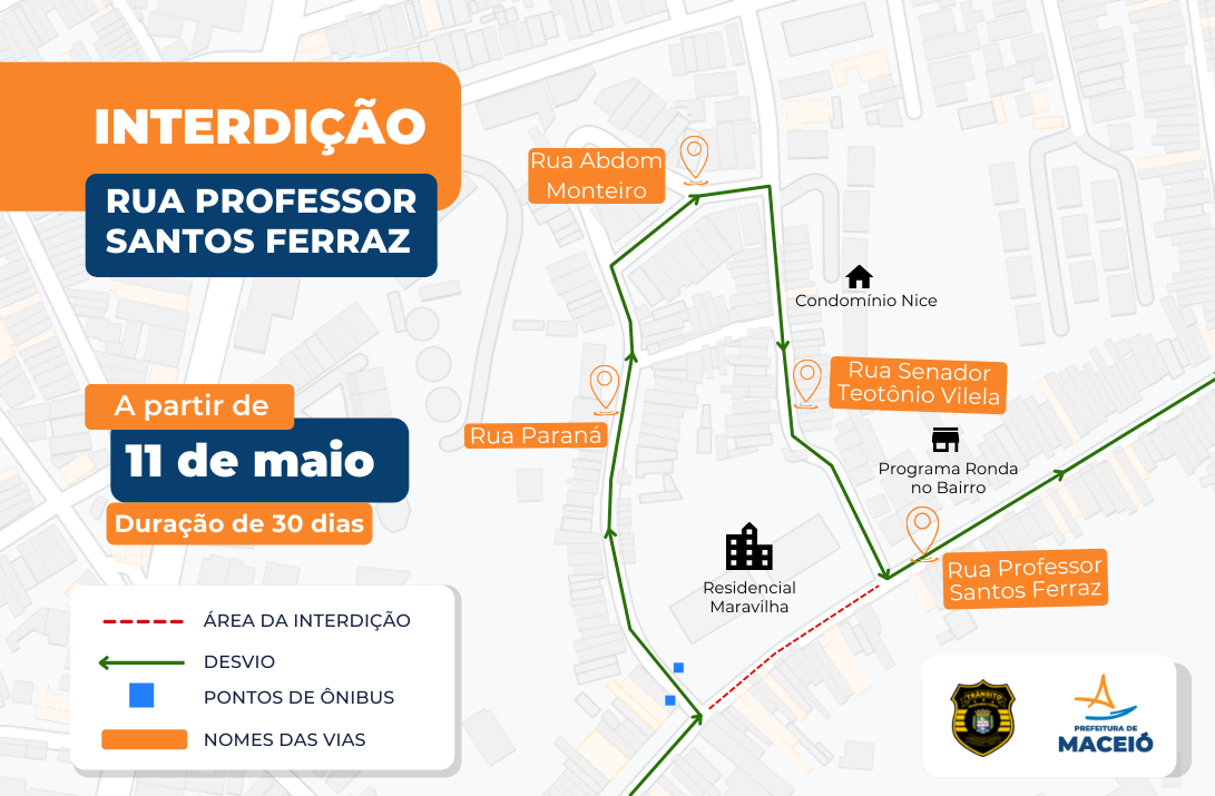 A interdição ocorrerá nas proximidades do Residencial Maravilha e os condutores precisarão desviar pela Rua Paraná, em seguida nas Ruas Abdom Monteiro e Teotônio Vilela, e por último, retornar para a Rua Santos Ferraz. Quem transita no sentido inverso também devem seguir pelas ruas sugeridas.