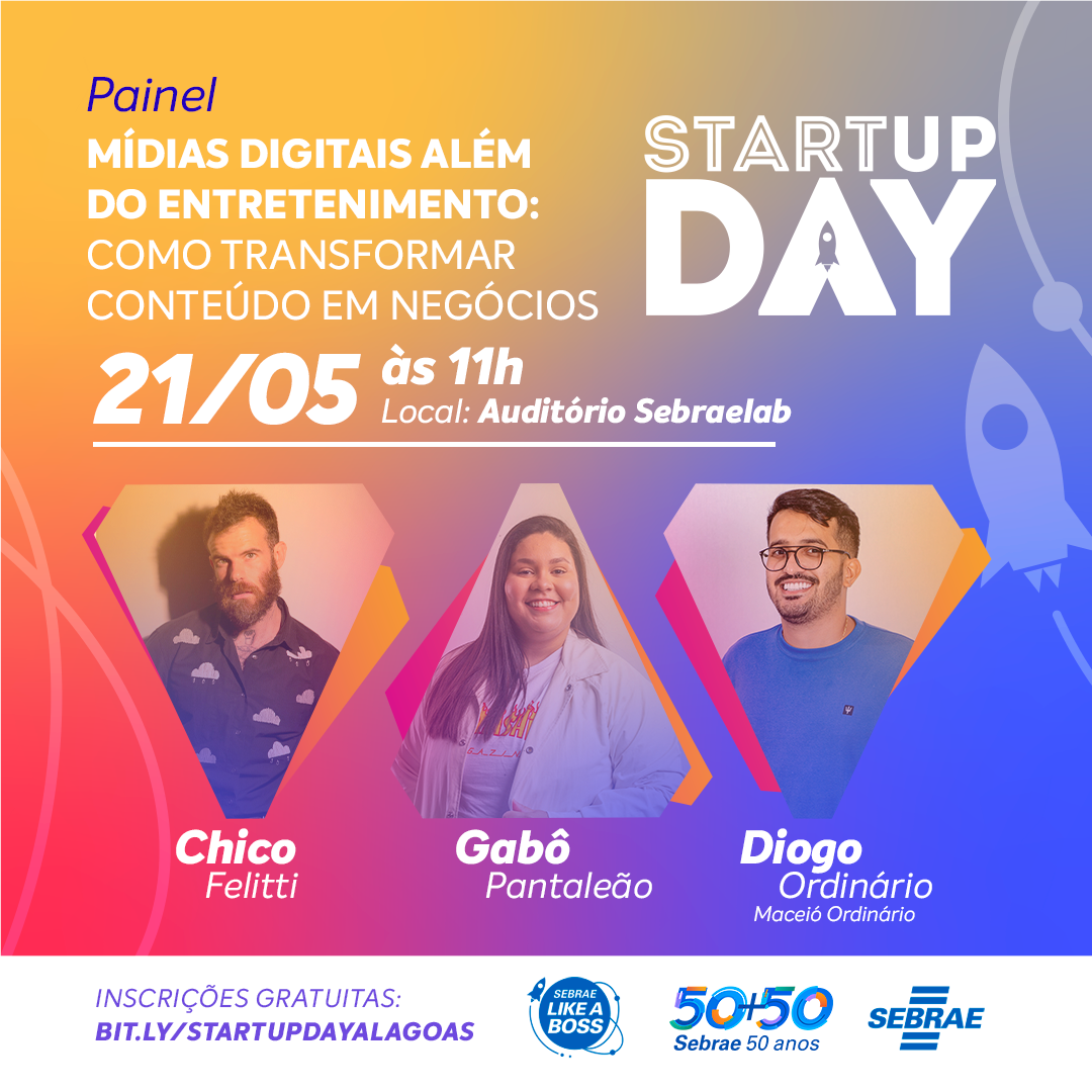 O Sebrae Alagoas realiza, no próximo sábado, dia 21, a edição 2022 do Sebrae Startup Day. Das 8h às 18h, em sua sede, haverá palestras, painéis, seminários, mentoria, exposição digital e espaço metaverso. O evento tem como público empreendedores de startups que estão em todos os momentos de maturidade: curiosidade, ideação, operação e crescimento. A inscrição é gratuita e deve ser feita pelo endereço eletrônico bit.ly/startupdayalagoas .