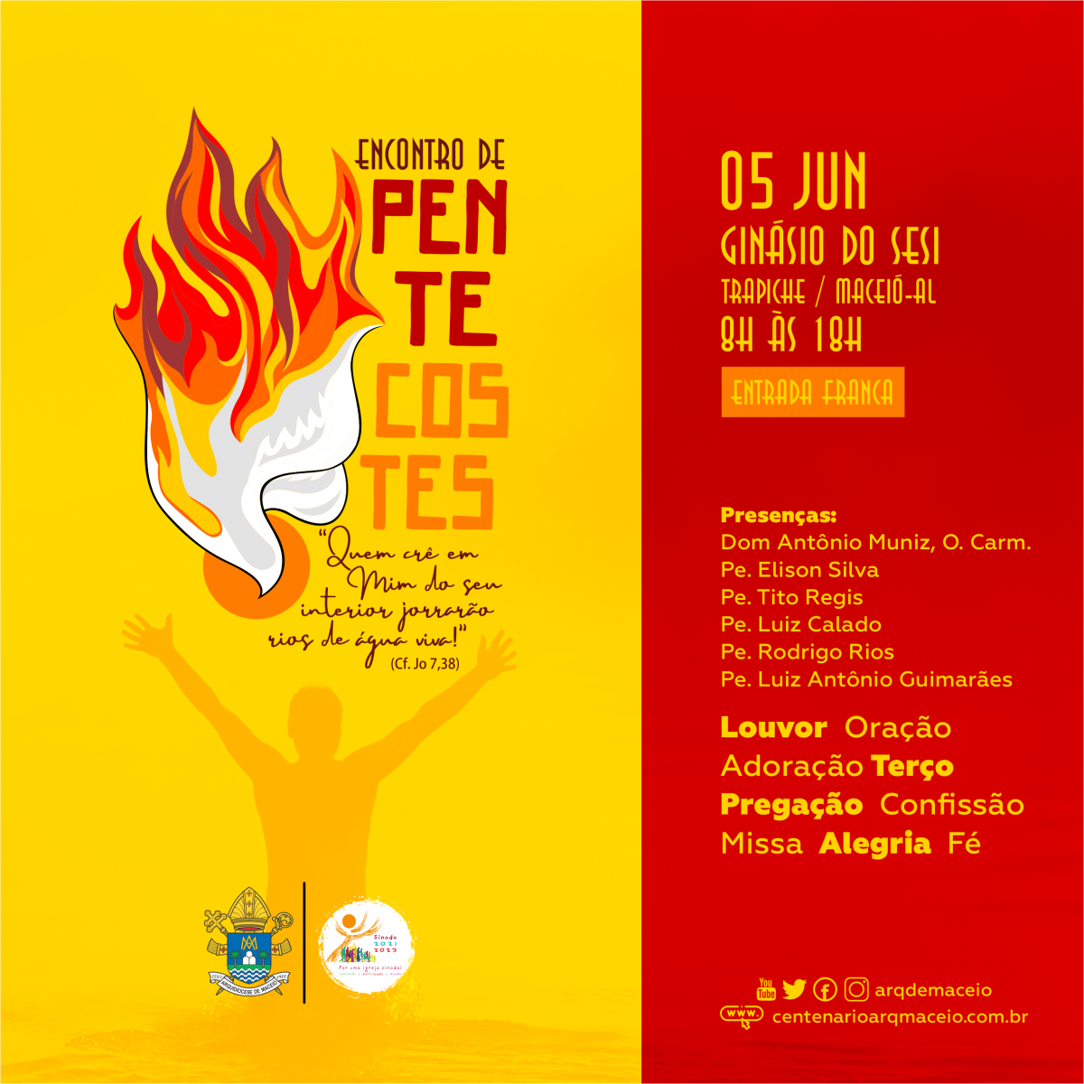 A Arquidiocese de Maceió vai realizar o encontro de Pentecostes no próximo dia 5 de junho no Ginásio do Sesi, no Trapiche da Barra. Após dois anos sem a realização do evento por causa da pandemia, as paróquias, movimentos e pastorais da capital e do interior estarão reunidas das 8h às 17h em momentos de louvor, pregação e Missa presidida por Dom Antônio Muniz Fernandes, O.Carm.