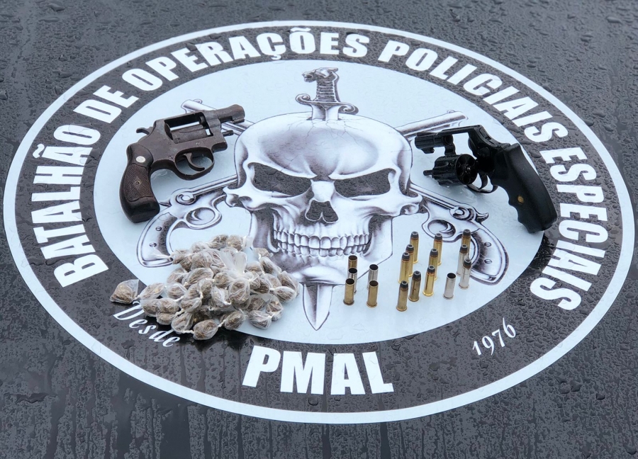 Dois revólveres calibre 38; 50 bombinhas de maconha; 11 munições calibre 38 intactas e mais seis deflagradas foram apreendidas por policiais do Batalhão de Operações Policiais Especiais (Bope) nesta terça-feira (24). O caso envolvendo Tráfico de drogas e Posse ilegal de arma de fogo ocorreu no Povoado Anel, município de Viçosa.