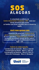 Segundo Lourdes Azevedo, coordenadora de extensão da Unit/AL, a tradicional “Campanha do Agasalho”, realizada anualmente pela instituição, foi repaginada e ampliada devido às fortes chuvas que desolaram famílias em Alagoas e neste ano recebeu o nome de “SOS Alagoas”, além de ter sido ampliada para que outros itens fossem arrecadados.