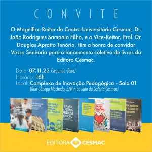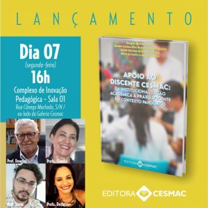 A abertura acontece na segunda (07), às 16, no Complexo de Inovações Pedagógicas – Sala Invertida 01, com o Lançamento Coletivo de Livros da Editora Cesmac. Serão lançadas oito publicações de autores docentes da Instituição. Uma das obras tem o título: “Apoio ao Discente Cesmac: Da Institucionalização Acadêmica à Práxis Docente em Contexto Pandêmico”, que tem como autores o vice-reitor e pró-reitor acadêmico, Prof. Dr. Douglas Apratto Tenório; a pró-reitora Acadêmica, Profa. Dra. Claudia Medeiros; a coordenadora do Apoio ao Discente; Profa. Dra. Maria do Desterro; e ainda o docente Prof. Dr. David Oliveira.