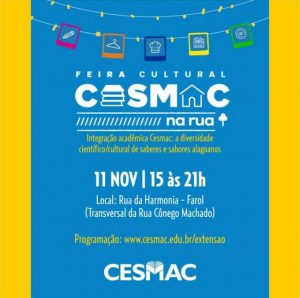 A semana será concluída com a Feira Cultural Cesmac na Rua, que traz o tema: “Integração Acadêmica Cesmac: a diversidade científico/cultural de saberes e sabores alagoanos. A iniciativa acontece no dia 11 de novembro, das 15h às 21, na Rua da Harmonia – Farol, que fica na transversal da Rua Cônego Machado.
