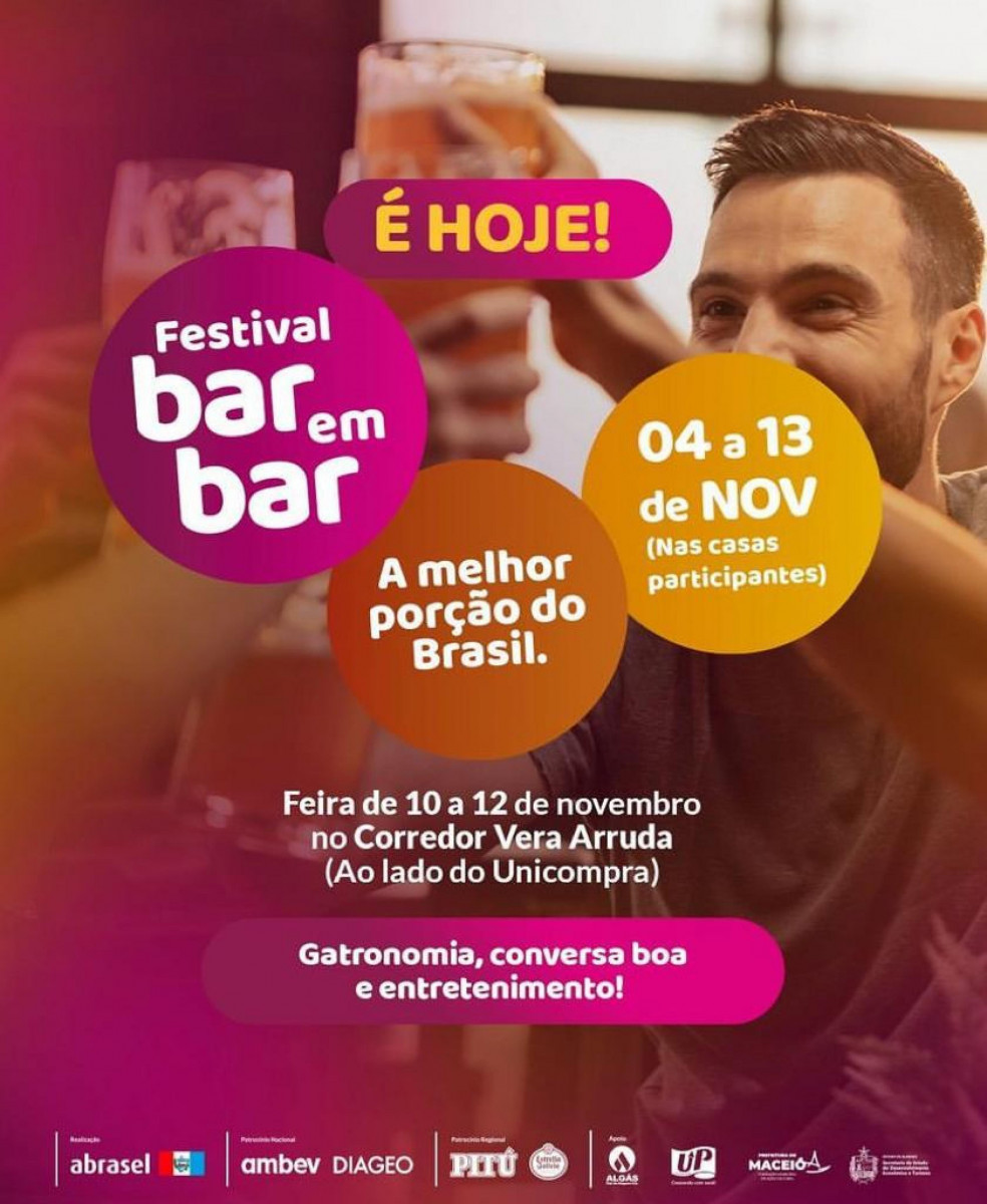 Com o objetivo de contribuir com a divulgação e valorização da gastronomia dos bares alagoanos, o Governo de Alagoas, por meio da Secretaria de Estado do Desenvolvimento Econômico e Turismo (Sedetur), está apoiando o Festival Bar em Bar e a Feira Gastronômica. Os eventos são de iniciativa da Associação Brasileira de Bares e Restaurantes do Estado (Abrasel) e já fazem parte do calendário gastronômico e dos amantes de botecos de Maceió.