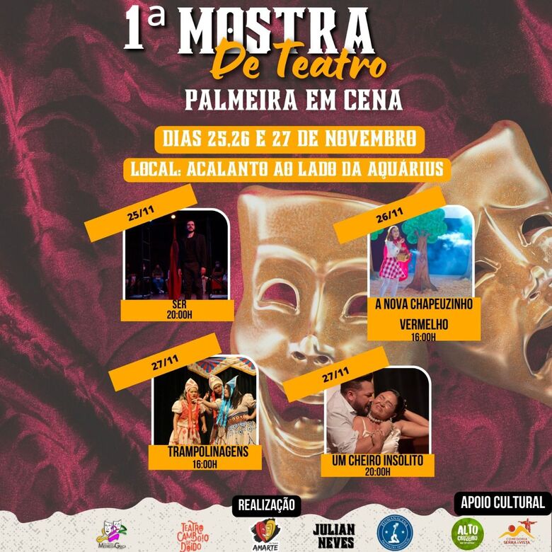 A iniciativa é levar a conhecimento do público palmeirense as artes cênicas produzidas na cidade ao longo dos anos de 2021 e 2022, a mostra contará com teatro infantil, teatro adulto, drama, comédia e espetáculos reflexivos, tudo preparado com muita arte dramática envolvida.