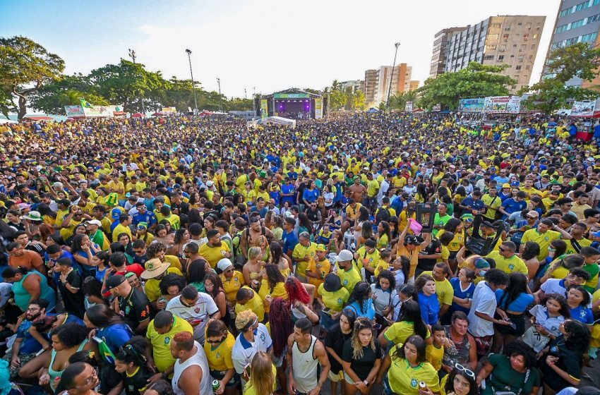 Multidão lota a Praça Multieventos, na Pajuçara, para assistir ao primeiro jogo do Brasil, na Copa do Mundo de 2022. Foto: Maivan Fernandéz / Secom Maceió