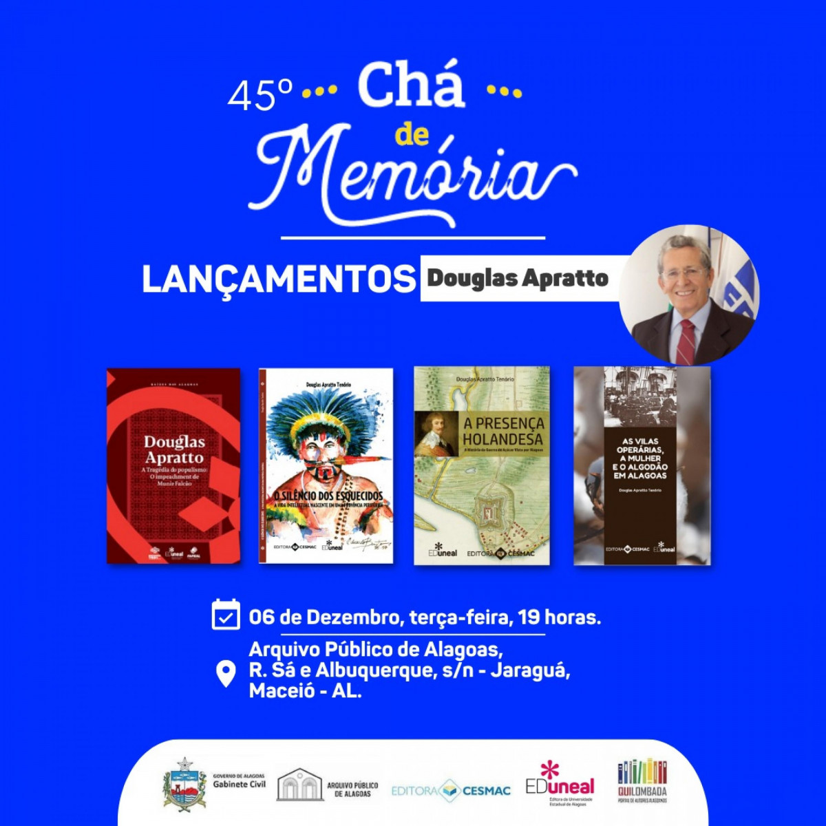 O Arquivo Público de Alagoas (APA) promove, no dia 6 de dezembro, às 19h, a 45ª edição do projeto Chá de Memória, com o lançamento de quatro livros do historiador e vice-reitor do Cesmac, Douglas Apratto Tenório: “As vilas operárias, a mulher e o algodão em Alagoas”, “O Silêncio dos Esquecidos”, “A presença Holandesa” e “A Tragédia do Populismo: o impeachment de Muniz Falcão”.
