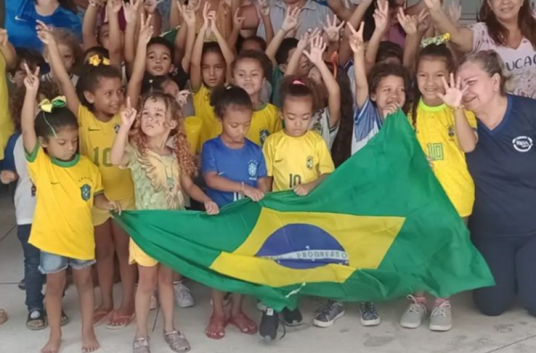 Crianças do CMEI Hermê Miranda, do Tabuleiro do Martins, comemoram a participação do Brasil na Copa do Mundo. Foto: cortesia