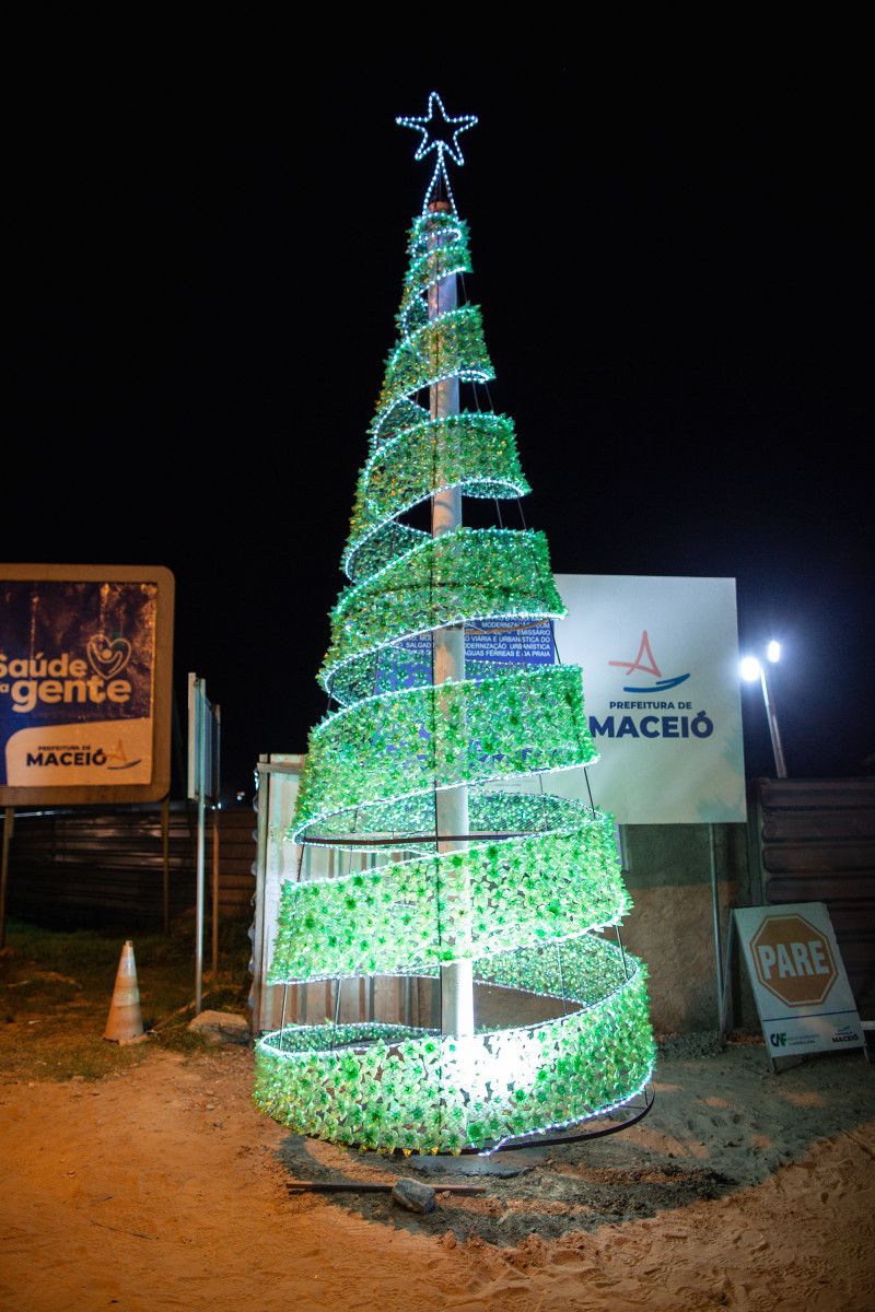 Diante do espírito natalino que já começa a ganhar cor, brilho e espaços totalmente decorados, ao longo de diversos bairros da capital, a Prefeitura de Maceió, por meio do projeto Renasce Salgadinho, instalou e ascendeu no início da noite desta quarta-feira (14), uma árvore de natal totalmente reciclável, no Vale do Reginaldo, no bairro do Poço.
