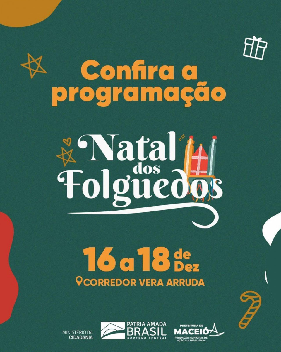 O Natal dos Folguedos começa nesta sexta-feira (16) e vai até domingo (18), a partir das 16h, no corredor Vera Arruda, na Jatiúca. O evento contará com diversas atrações culturais locais e programação diversificada, distribuídas entre quatro palcos e na tenda cultural, montados ao longo do corredor.