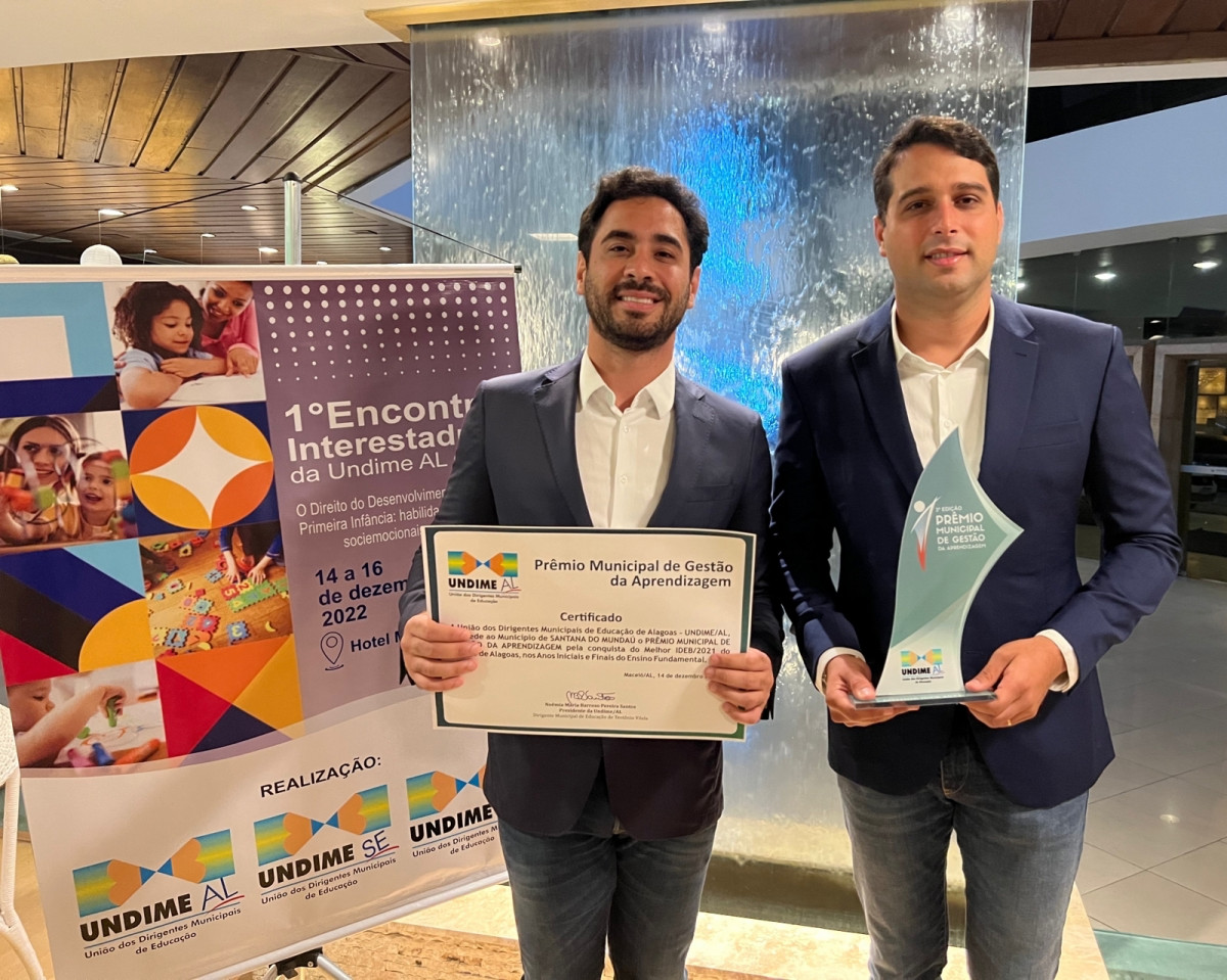 Nesta quarta-feira (14) a União Nacional dos Dirigentes Municipais de Educação (Undime), realizou, em Maceió, a entrega do Prêmio Municipal de Gestão da Aprendizagem aos dez municípios que tiveram o melhor crescimento no Índice de Desenvolvimento da Educação Básica (Ideb) 2021. Com a maior média de Alagoas nos anos finais do ensino fundamental, a Educação de Santana do Mundaú foi um dos destaques da noite.